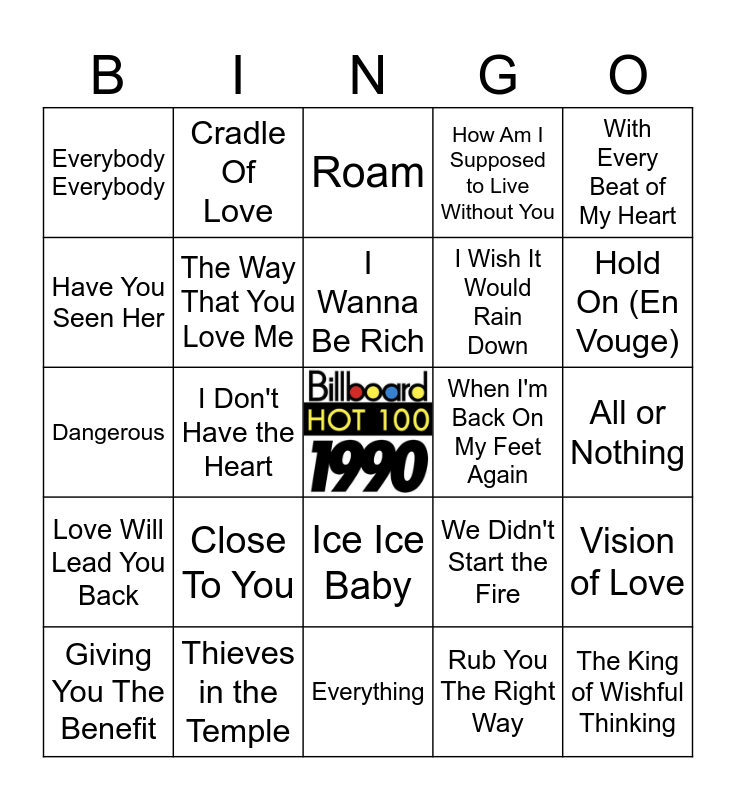 This bingo card has a free space and 98 words: (Can't Live Without Your) Love And Affection, All Around the World, All I Wanna Do Is Make Love To You, All or Nothing, Alright, Another Day In Paradise, Back To Life, Black Cat, Black Velvet, Blame It on the Rain, Blaze Of Glory, C'mon And Get My Love, Can't Stop, Close To You, Come Back To Me, Cradle Of Love, Dangerous, Do Me!, Do You Remember?, Don't Know Much, Don't Wanna Fall in Love, Downtown Train, Enjoy the Silence, Epic, Escapade, Everybody Everybody, Everything, Forever, Free Fallin', Get Up (Before The Night Is Over), Giving You The Benefit, Have You Seen Her, Here and Now, Here We Are, Hold On (En Vouge), Hold On (Wilson Phillips), How Am I Supposed to Live Without You, How Can We Be Lovers, I Don't Have the Heart, I Go to Extremes, I Remember You, I Wanna Be Rich, I Wish It Would Rain Down, I'll Be Your Everything, I'll Be Your Shelter, Ice Ice Baby, If Wishes Came True, It Must Have Been Love, Janie's Got A Gun, Jerk Out #3, Just a Friend, Just Between You and Me, Just Like Jesse James, Love Shack, Love Song, Love Takes Time, Love Will Lead You Back, Make You Sweat, Mentirosa, No More Lies, Nothing Compares 2 U, Oh Girl, Opposites Attract, Poison, Praying for Time, Price of Love, Pump Up The Jam, Ready Or Not, Release Me, Rhythm Nation, Roam, Romeo, Rub You The Right Way, Sending All My Love, She Ain't Worth It, Something Happened On The Way To Heaven, Step by Step, Swing The Mood, The Humpty Dance, The King of Wishful Thinking, The Power, The Way That You Love Me, Thieves in the Temple, This One's for the Children, Tic Tac Toe, Two To Make It Right, U Can't Touch This, Unskinny Bop, Vision of Love, Vogue, We Can't Go Wrong, We Didn't Start the Fire, What It Takes, What Kind of Man Would I Be?, When I'm Back On My Feet Again, Whip Appeal, With Every Beat of My Heart and Without You.