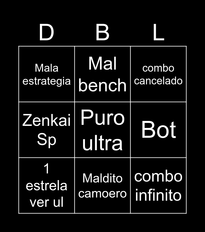 This bingo card has a free space and 24 words: Mucho bench, Ui zenkai, Maldito camoero, Puro daima, combo infinito, Mala estrategia, Bot, Mal bench, Future, Zamasu, Trunks, forfeit, Eq A, 1 v 3, 1 estrela ver ul, W, Lag, combo cancelado, Tag switch, Kamehameha, Good Lf, Zenkai LL, Zenkai Sp and neutro.