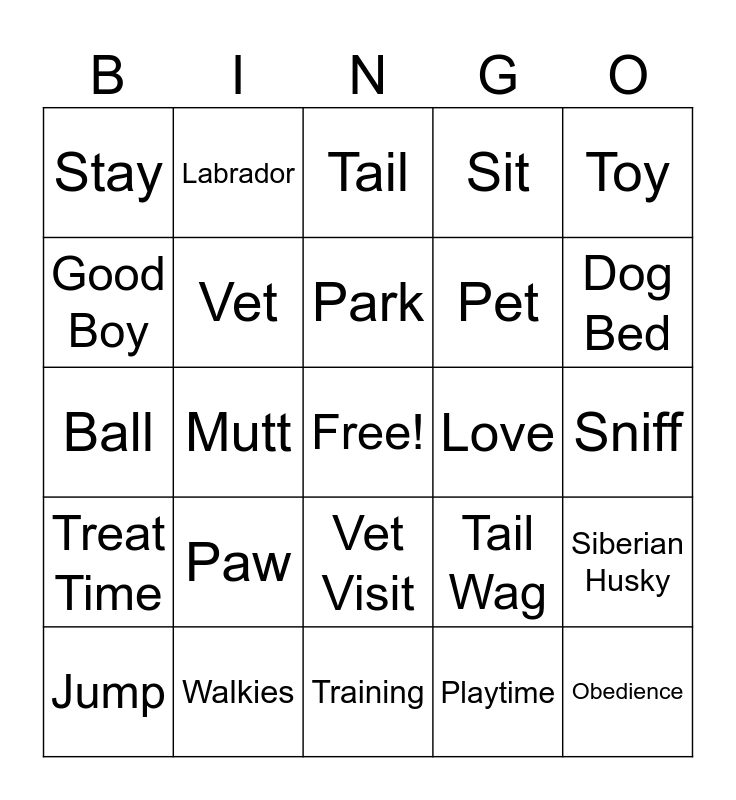 This bingo card has a free space and 79 words: Dog, Puppy, Tail, Bark, Fetch, Walk, Treat, Leash, Collar, Bone, Play, Woof, Sit, Stay, Heel, Good Boy, Good Girl, Paw, Fur, Sniff, Chew, Toy, Ball, Park, Vet, Adopt, Rescue, Kennel, Grooming, Bath, Dog Bed, Crate, Training, Run, Jump, Love, Loyal, Friend, Companion, Obedience, Agility, Breed, Poodle, Beagle, Bulldog, Labrador, Golden Retriever, Chihuahua, Dachshund, Border Collie, Siberian Husky, Mutt, Tail Wag, Snuggle, Cuddle, Bones, Chew Toy, Squeaky, Dog Park, Vet Visit, Pet, Happy, Healthy, Sit, Stay, Good Dog, Belly Rub, Nose, Puppy Eyes, Treat Time, Walkies, Dog Show, Kennel, Dog Bowl, Friendship, Playtime, Training, Rescue Dog and Paw Print.
