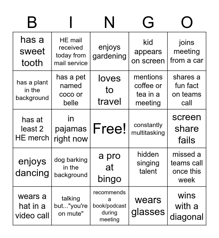 This bingo card has a free space and 24 words: dog barking in the background, talking but..."you're on mute", loves to travel, wears a hat in a video call, joins meeting from a car, has a sweet tooth, has a plant in the background, HE mail received today from mail service, constantly multitasking, a pro at bingo, mentions coffee or tea in a meeting, has at least 2 HE merch, hidden singing talent, missed a teams call once this week, has a pet named coco or belle, wears glasses, screen share fails, enjoys gardening, shares a fun fact on teams call, in pajamas right now, wins with a diagonal, enjoys dancing, kid appears on screen and recommends a book/podcast during meeting.