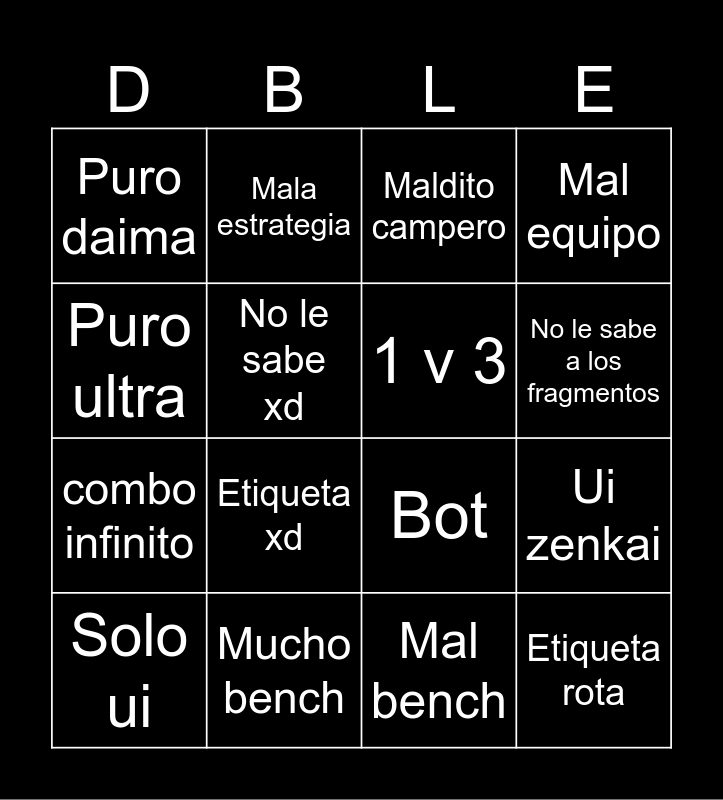 This bingo card has 16 words: Mucho bench, Ui zenkai, Maldito campero, Puro daima, combo infinito, Mala estrategia, Bot, Mal bench, Puro ultra, No le sabe xd, Solo ui, Mal equipo, Etiqueta xd, No le sabe a los fragmentos, 1 v 3 and Etiqueta rota.