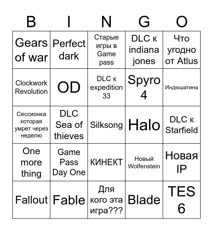 This bingo card has a free space and 24 words: Game Pass Day One, Fable, DLC к expedition 33, Fallout, Что угодно от Atlus, Gears of war, Clockwork Revolution, Perfect dark, Halo, КИНЕКТ, Spyro 4, Сессионка которая умрет через неделю, Новый Wolfenstein, Новая IP, OD, Blade, DLC к Starfield, Старые игры в Game pass, Индюшатина, DLC Sea of thieves, TES 6, One more thing, DLC к indiana jones and Для кого эта игра???.