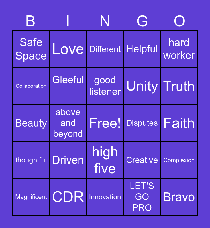 This bingo card has a free space and 39 words: Identity, Marvelous, Ambitious, Gleeful, Magnificent, high five, good listener, patient, hard worker, thoughtful, above and beyond, Helpful, Bravo, Faith, Disputes, Driven, Pride Parade, Safe Space, Empowerment, Creative, Collaboration, Innovation, Unity, Truth, Team spirit, Accessibility, Glitter, Authentic, Cultural awareness, Love, Equality, Wix, Different, CDR, LET'S GO PRO, Skin, Complexion, Beauty and Mentality.