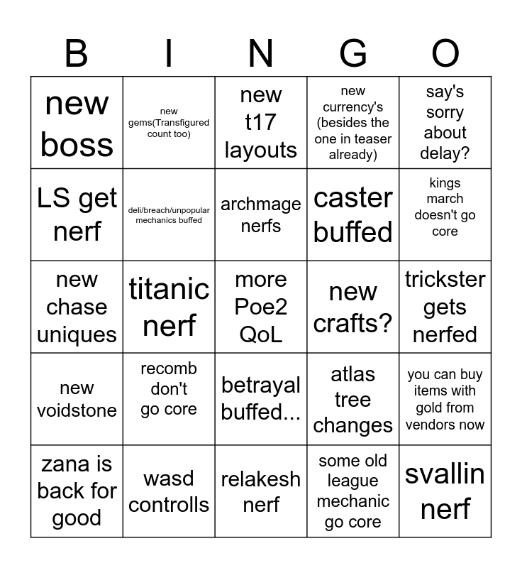 This bingo card has a free space and 24 words: recomb don't go core, wasd controlls, archmage nerfs, zana is back for good, say's sorry about delay?, new boss, LS get nerf, new gems(Transfigured count too), new crafts?, betrayal buffed..., caster buffed, new chase uniques, atlas tree changes, you can buy items with gold from vendors now, deli/breach/unpopular mechanics buffed, some old league mechanic go core, trickster gets nerfed, new t17 layouts, kings march doesn't go core, titanic nerf, svallin nerf, new voidstone, new currency's (besides the one in teaser already) and relakesh nerf.