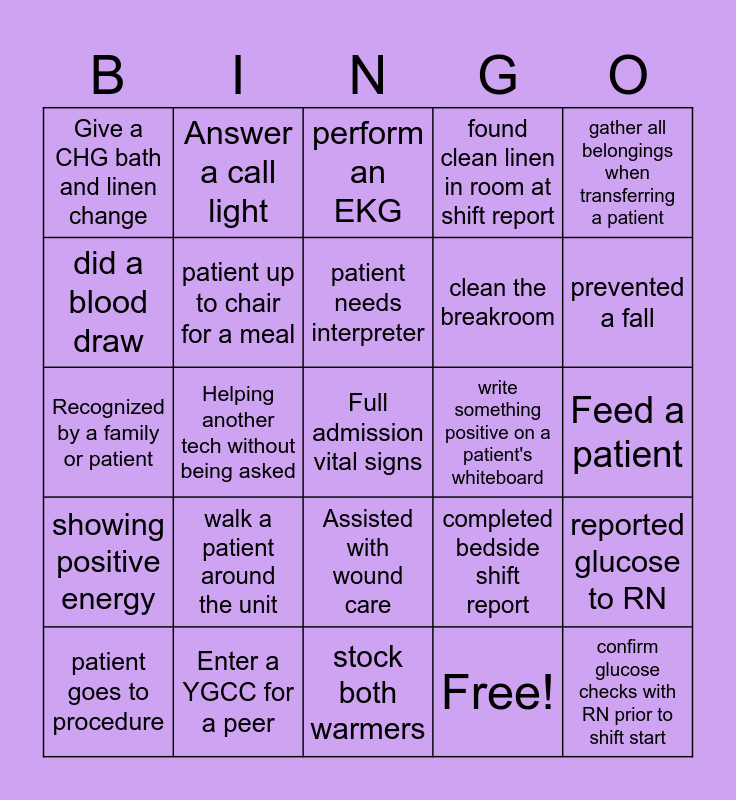 This bingo card has 30 words: Enter a YGCC for a peer, provide oral care, Helping another tech without being asked, Remove meal tray, Give a CHG bath and linen change, perform an EKG, patient up to chair for a meal, Assisted with wound care, write something positive on a patient's whiteboard, stock both warmers, Feed a patient, Full admission vital signs, Free!, confirm glucose checks with RN prior to shift start, prevented a fall, remained with patient while in bathroom, completed bedside shift report, showing positive energy, walk a patient around the unit, gather all belongings when transferring a patient, Recognized by a family or patient, Relieve a sitter for lunch or break, Answer a call light, clean the breakroom, did a blood draw, found clean linen in room at shift report, reported glucose to RN, patient goes to procedure, patient needs interpreter and got asked by a RN to get patient water.