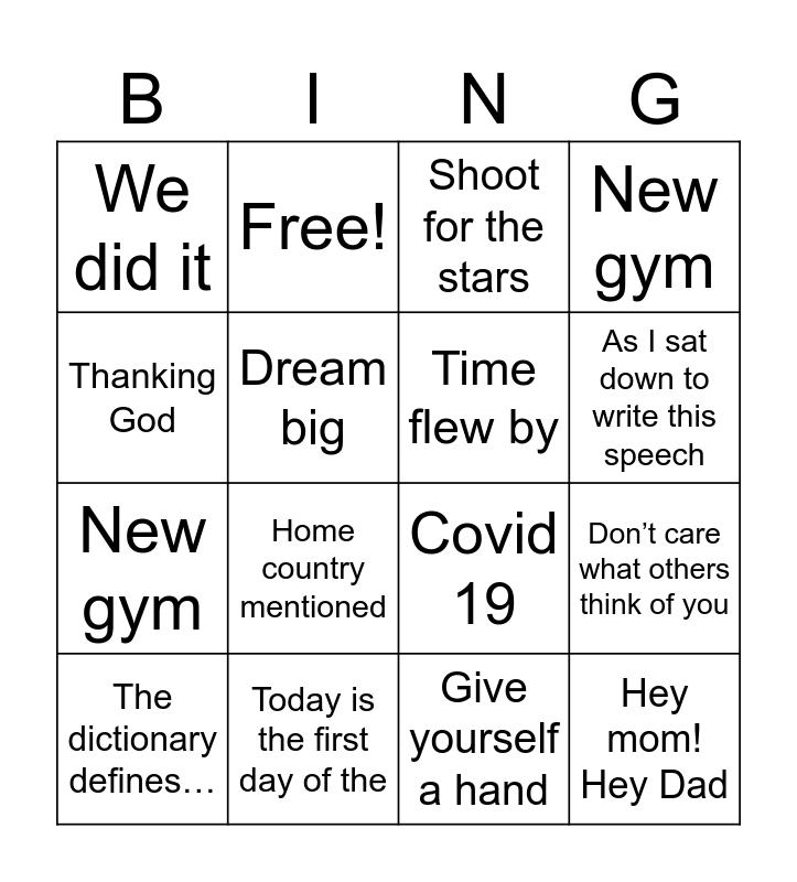 This bingo card has 19 words: Covid 19, Be yourself, Shoot for the stars, Hey mom! Hey Dad, Don’t care what others think of you, Thanking God, Give yourself a hand, We did it, Free!, New gym, Home country mentioned, Dream big, Time flew by, Today is the first day of the, The dictionary defines…, I’m proud of all of us, New gym, As I sat down to write this speech and LGBTQ mention.
