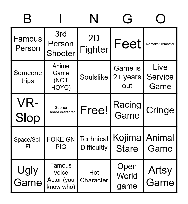 This bingo card has a free space and 32 words: Open World game, “Woke”, Gooner Game/Character, Sport Slop, Space/Sci-Fi, Anime Game (NOT HOYO), Remake/Remaster, Animal Game, 3rd Person Shooter, Party Game Slop, Soulslike, 2D Fighter, Chud presenter, Dead Company revives, Racing Game, Edging Announcement, Ugly Game, VR-Slop, Technical Difficultly, FOREIGN PIG, Kojima Stare, DLC Drop, Cringe, Famous Voice Actor (you know who), Artsy Game, Feet, Game is 2+ years out, Someone trips, Famous Person, Hot Character, Hot presenter and Live Service Game.