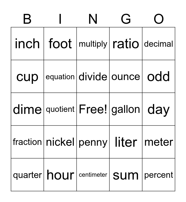 This bingo card has a free space and 32 words: sum, difference, quotient, addend, fraction, equation, decimal, meter, foot, pound, divide, multiply, graph, axis, gallon, pint, quarter, dime, penny, nickel, liter, year, day, hour, percent, ratio, ounce, cup, inch, centimeter, even and odd.