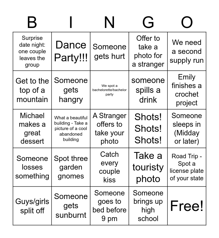 This bingo card has 34 words: Free!, Someone brings up high school, A stranger calls Mike tall, Someone forgets to pack something, Someone losses something, Someone gets hangry, We need a second supply run, Guys/girls split off, Dance Party!!!, Ali says something hilarious/ free space, We spot a bachelorette/bachelor party, Someone gets hurt, Bad weather changes plans, These are not the vibes..., Shots! Shots! Shots!, Emily finishes a crochet project, Someone gets sunburnt, Michael makes a great dessert, Spot three garden gnomes, Take a touristy photo, Catch every couple kiss, Same person wins clue twice in a row, Surprise date night: one couple leaves the group, Someone sleeps in (Midday or later), Someone goes to bed before 9 pm, A Stranger offers to take your photo, Offer to take a photo for a stranger, Spot a dog with spots, someone spills a drink, Get to the top of a mountain, Convince Mandy to hang out with just your couple, What a beautiful building - Take a picture of a cool abandoned building, Road Trip - Spot a license plate of your state and America! - Spot a Bald Eagle.