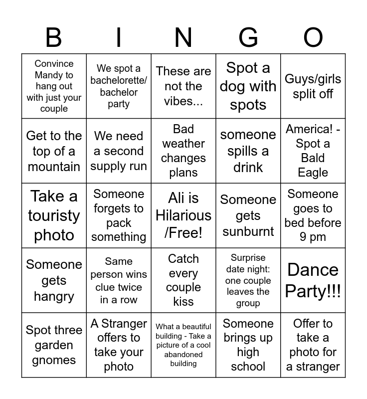 This bingo card has a free space and 32 words: Someone brings up high school, A stranger calls Mike tall, Someone forgets to pack something, Someone losses something, Someone gets hangry, We need a second supply run, Guys/girls split off, Dance Party!!!, We spot a bachelorette/ bachelor party, Someone gets hurt, Bad weather changes plans, These are not the vibes..., Shots! Shots! Shots!, Emily finishes a crochet project, Someone gets sunburnt, Michael makes a great dessert, Spot three garden gnomes, Take a touristy photo, Catch every couple kiss, Same person wins clue twice in a row, Surprise date night: one couple leaves the group, Someone sleeps in (Midday or later), Someone goes to bed before 9 pm, A Stranger offers to take your photo, Offer to take a photo for a stranger, Spot a dog with spots, someone spills a drink, Get to the top of a mountain, Convince Mandy to hang out with just your couple, What a beautiful building - Take a picture of a cool abandoned building, Road Trip - Spot a license plate of your state and America! - Spot a Bald Eagle.