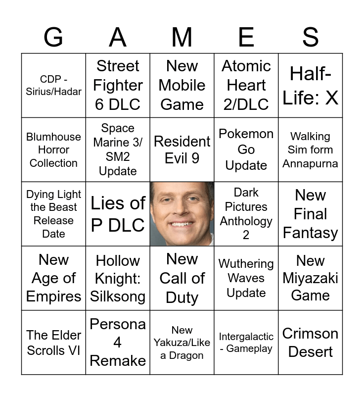 This bingo card has a free space and 24 words: Hollow Knight: Silksong, Persona 4 Remake, Resident Evil 9, The Elder Scrolls VI, Half-Life: X, CDP - Sirius/Hadar, Blumhouse Horror Collection, Street Fighter 6 DLC, Dark Pictures Anthology 2, New Call of Duty, Pokemon Go Update, Dying Light the Beast Release Date, Wuthering Waves Update, New Miyazaki Game, Space Marine 3/ SM2 Update, Intergalactic - Gameplay, New Final Fantasy, New Mobile Game, Walking Sim form Annapurna, Lies of P DLC, Crimson Desert, New Age of Empires, Atomic Heart 2/DLC and New Yakuza/Like a Dragon.