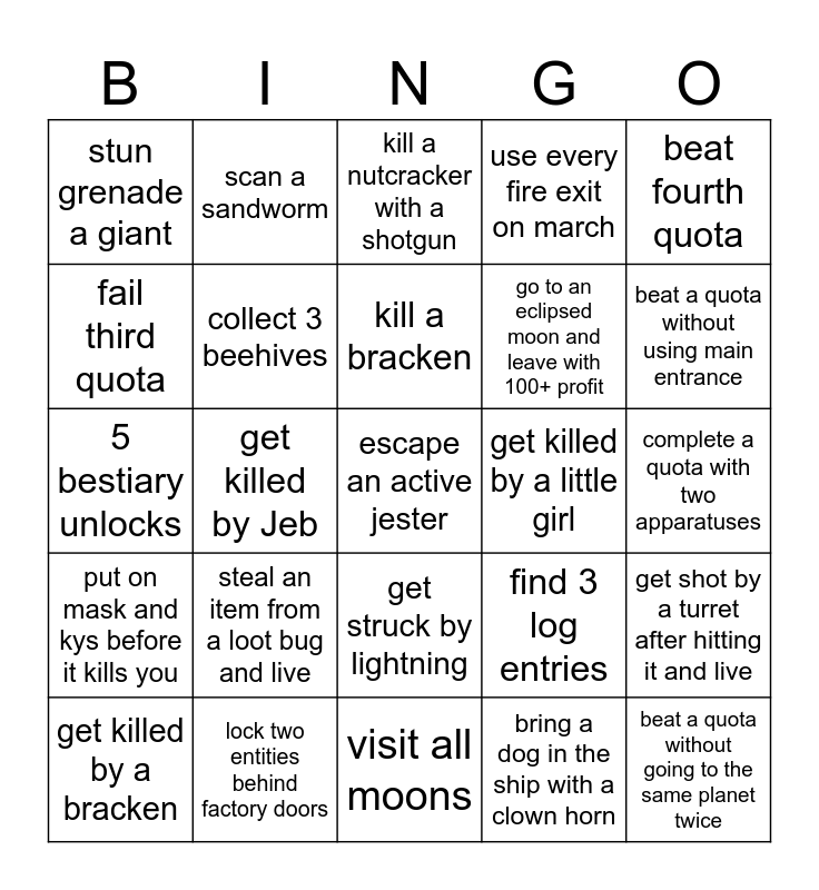 This bingo card has 25 words: steal an item from a loot bug and live, visit all moons, kill a bracken, get killed by a bracken, beat fourth quota, stun grenade a giant, fail third quota, scan a sandworm, get killed by a little girl, get struck by lightning, go to an eclipsed moon and leave with 100+ profit, 5 bestiary unlocks, find 3 log entries, get shot by a turret after hitting it and live, collect 3 beehives, beat a quota without going to the same planet twice, complete a quota with two apparatuses, kill a nutcracker with a shotgun, beat a quota without using main entrance, get killed by Jeb, escape an active jester, lock two entities behind factory doors, put on mask and kys before it kills you, use every fire exit on march and bring a dog in the ship with a clown horn.