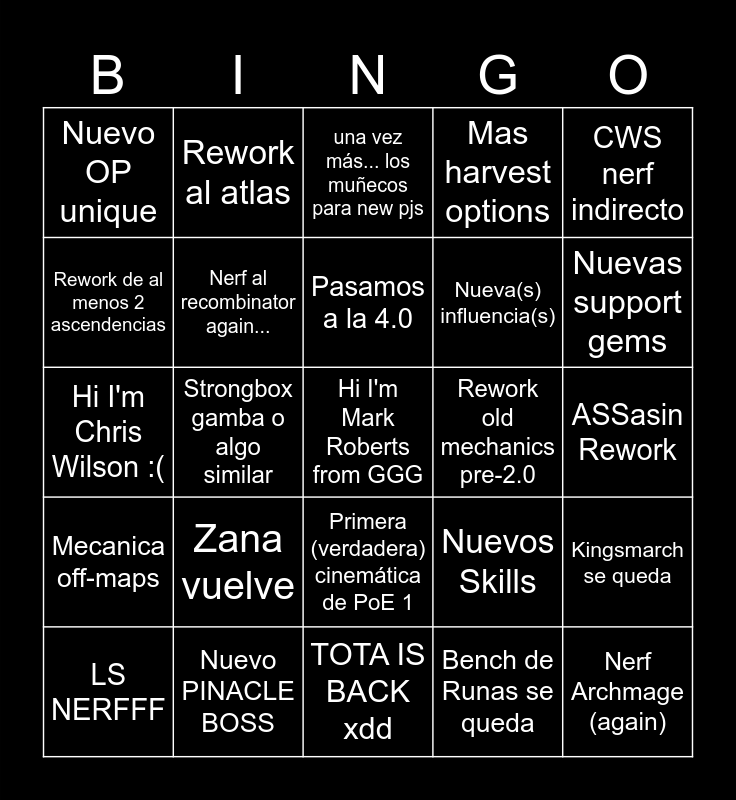 This bingo card has a free space and 24 words: Zana vuelve, Nuevo PINACLE BOSS, Pasamos a la 4.0, LS NERFFF, CWS nerf indirecto, Nuevo OP unique, Rework de al menos 2 ascendencias, Rework al atlas, Rework old mechanics pre-2.0, Primera (verdadera) cinemática de PoE 1, Nueva(s) influencia(s), Hi I'm Chris Wilson :(, Nuevos Skills, Kingsmarch se queda, Nerf al recombinator again..., Bench de Runas se queda, ASSasin Rework, una vez más... los muñecos para new pjs, Nuevas support gems, Strongbox gamba o algo similar, Nerf Archmage (again), Mecanica off-maps, Mas harvest options and TOTA IS BACK xdd.