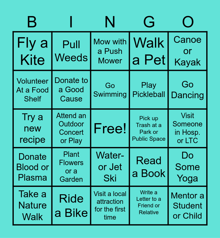 This bingo card has a free space and 24 words: Plant Flowers or a Garden, Ride a Bike, Go Swimming, Take a Nature Walk, Canoe or Kayak, Fly a Kite, Volunteer At a Food Shelf, Pull Weeds, Pick up Trash at a Park or Public Space, Water- or Jet Ski, Play Pickleball, Try a new recipe, Read a Book, Do Some Yoga, Donate to a Good Cause, Write a Letter to a Friend or Relative, Visit Someone in Hosp. or LTC, Mow with a Push Mower, Go Dancing, Attend an Outdoor Concert or Play, Mentor a Student or Child, Donate Blood or Plasma, Walk a Pet and Visit a local attraction for the first time.