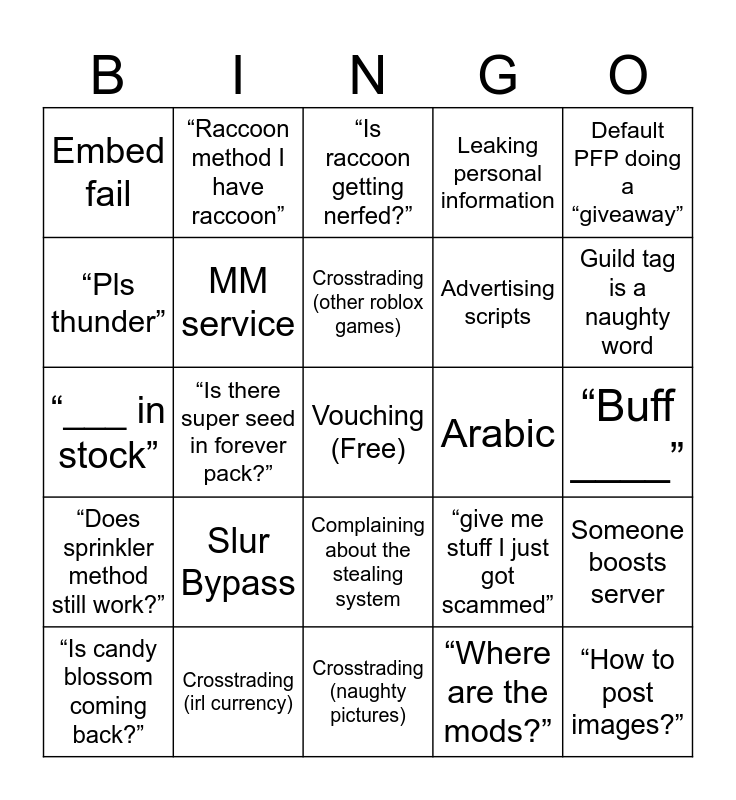 This bingo card has a free space and 24 words: Slur Bypass, Crosstrading (irl currency), Crosstrading (other roblox games), “Is candy blossom coming back?”, Default PFP doing a “giveaway”, Embed fail, “Pls thunder”, “Raccoon method I have raccoon”, Arabic, Complaining about the stealing system, Advertising scripts, “___ in stock”, “give me stuff I just got scammed”, Someone boosts server, MM service, “Where are the mods?”, “Buff ____”, “Is raccoon getting nerfed?”, Guild tag is a naughty word, “Is there super seed in forever pack?”, “How to post images?”, “Does sprinkler method still work?”, Leaking personal information and Crosstrading (naughty pictures).
