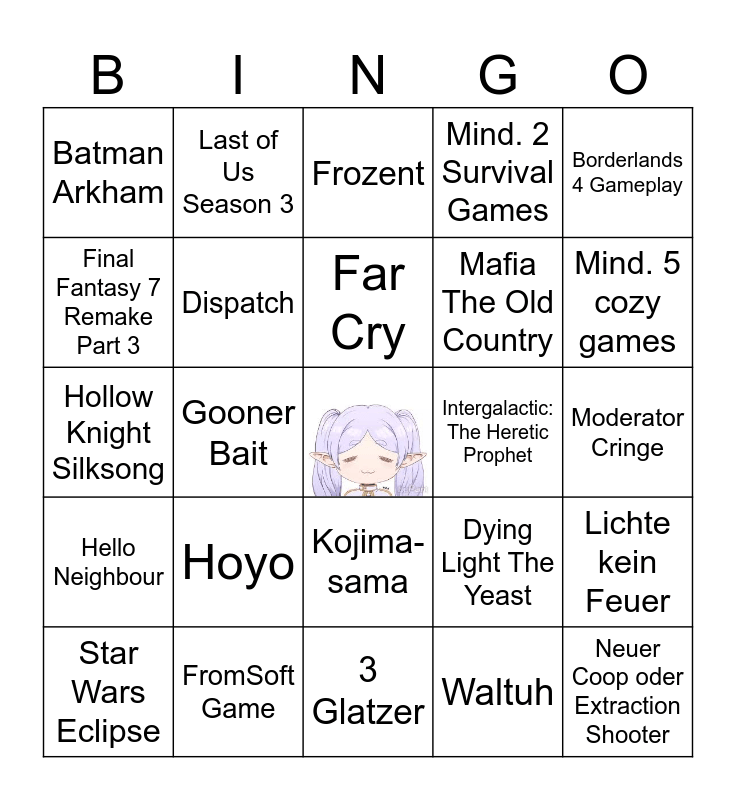 This bingo card has a free space and 24 words: Hoyo, FromSoft Game, Far Cry, Star Wars Eclipse, Borderlands 4 Gameplay, Batman Arkham, Final Fantasy 7 Remake Part 3, Last of Us Season 3, Intergalactic: The Heretic Prophet, Kojima-sama, Mafia The Old Country, Hollow Knight Silksong, Dying Light The Yeast, Lichte kein Feuer, Dispatch, Waltuh, Moderator Cringe, Frozent, Mind. 5 cozy games, Gooner Bait, Neuer Coop oder Extraction Shooter, Hello Neighbour, Mind. 2 Survival Games and 3 Glatzer.