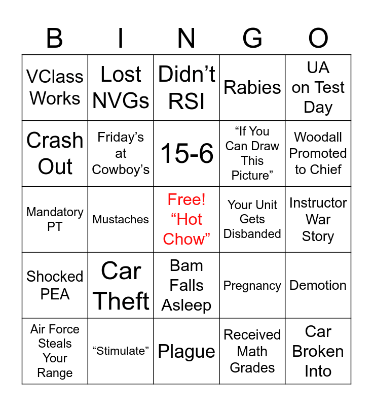 This bingo card has a free space and 24 words: Car Theft, “Stimulate”, 15-6, Air Force Steals Your Range, UA on Test Day, VClass Works, Crash Out, Lost NVGs, Your Unit Gets Disbanded, Bam Falls Asleep, “If You Can Draw This Picture”, Mandatory PT, Pregnancy, Demotion, Friday’s at Cowboy’s, Received Math Grades, Instructor War Story, Didn’t RSI, Woodall Promoted to Chief, Mustaches, Car Broken Into, Shocked PEA, Rabies and Plague.
