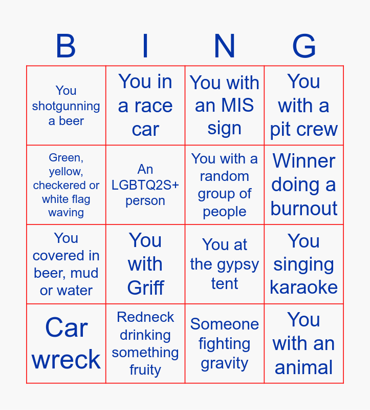 This bingo card has 16 words: Car wreck, Redneck drinking something fruity, You with an MIS sign, You with a pit crew, Green, yellow, checkered or white flag waving, You in a race car, You at the gypsy tent, You singing karaoke, You shotgunning a beer, An LGBTQ2S+ person, Someone fighting gravity, Winner doing a burnout, You covered in beer, mud or water, You with Griff, You with a random group of people and You with an animal.