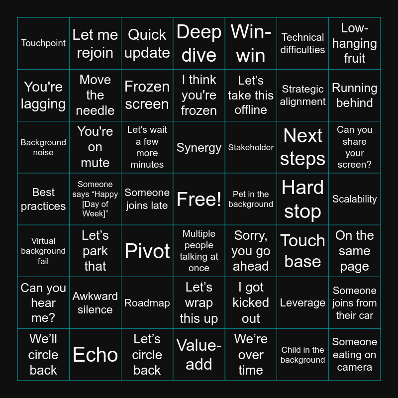 This bingo card has a free space and 51 words: Can you hear me?, You're on mute, Let’s circle back, Synergy, Let’s take this offline, Touch base, Low-hanging fruit, Bandwidth, Move the needle, Pivot, Deep dive, Win-win, Next steps, On the same page, Best practices, Echo, Frozen screen, I think you're frozen, I got kicked out, Technical difficulties, Can you share your screen?, You're lagging, Let me rejoin, Let's wait a few more minutes, We’re over time, Hard stop, Running behind, We’ll circle back, Let’s park that, Quick update, Let’s wrap this up, Pet in the background, Child in the background, Someone eating on camera, Background noise, Awkward silence, Someone joins late, Multiple people talking at once, Sorry, you go ahead, Leverage, Scalability, Touchpoint, KPI, Roadmap, Value-add, Stakeholder, Strategic alignment, Someone joins from their car, Virtual background fail, Someone says “Happy [Day of Week]” and Someone forgets they're on camera.