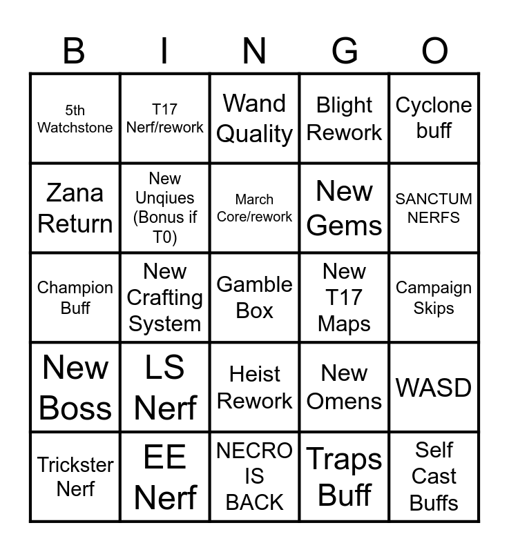 This bingo card has a free space and 24 words: LS Nerf, EE Nerf, March Core/rework, Trickster Nerf, Cyclone buff, 5th Watchstone, Zana Return, T17 Nerf/rework, New T17 Maps, Heist Rework, New Gems, Champion Buff, New Omens, WASD, New Unqiues (Bonus if T0), Traps Buff, Campaign Skips, Wand Quality, SANCTUM NERFS, New Crafting System, Self Cast Buffs, New Boss, Blight Rework and NECRO IS BACK.