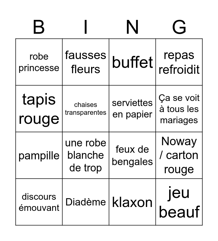 This bingo card has 16 words: Diadème, Noway / carton rouge, buffet, robe princesse, pampille, fausses fleurs, feux de bengales, klaxon, tapis rouge, chaises transparentes, discours émouvant, repas refroidit, une robe blanche de trop, Ça se voit à tous les mariages, serviettes en papier and jeu beauf.