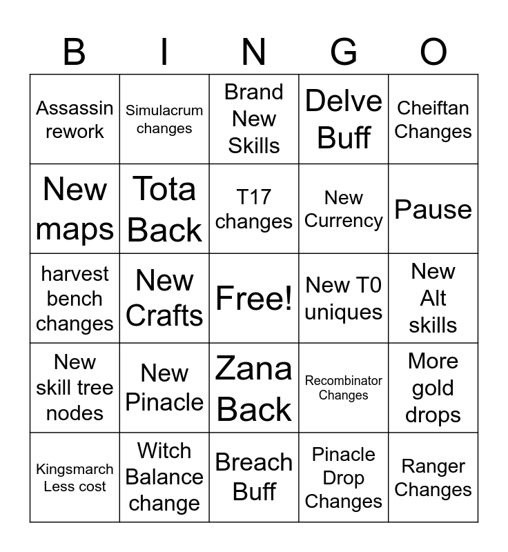 This bingo card has a free space and 24 words: New Pinacle, Witch Balance change, T17 changes, Kingsmarch Less cost, Cheiftan Changes, Assassin rework, New maps, Simulacrum changes, New T0 uniques, Zana Back, New Currency, harvest bench changes, Recombinator Changes, More gold drops, Tota Back, Pinacle Drop Changes, New Alt skills, Brand New Skills, Pause, New Crafts, Ranger Changes, New skill tree nodes, Delve Buff and Breach Buff.