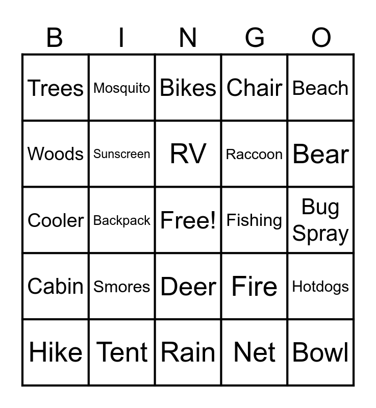 This bingo card has a free space and 24 words: Smores, Tent, RV, Hike, Beach, Trees, Woods, Mosquito, Fishing, Deer, Raccoon, Cooler, Fire, Hotdogs, Sunscreen, Net, Bug Spray, Bikes, Bear, Backpack, Bowl, Cabin, Chair and Rain.