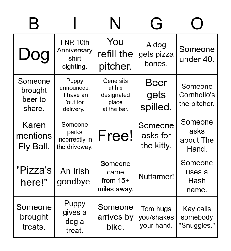 This bingo card has a free space and 26 words: Someone came from 15+ miles away., Tom hugs you/shakes your hand., Gene sits at his designated place at the bar., Puppy gives a dog a treat., Someone under 40., Dog, Someone brought beer to share., FNR 10th Anniversary shirt sighting., Someone asks about The Hand., Nutfarmer!, Beer gets spilled., Karen mentions Fly Ball., Someone uses a Hash name., Someone brought treats., Someone parks incorrectly in the driveway., Someone runs., A dog gets pizza bones., "Pizza's here!", You refill the pitcher., Kay calls somebody "Snuggles.", Someone Cornholio's the pitcher., Someone arrives by bike., Someone asks for the kitty., An Irish goodbye., Puppy announces, "I have an 'out for delivery." and Someone over 75..