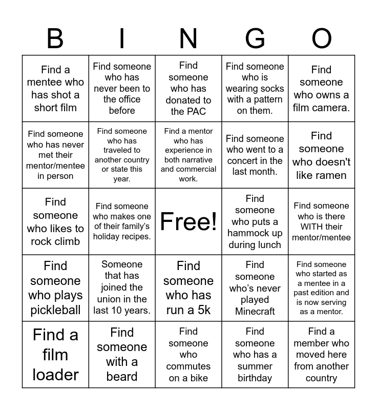 This bingo card has a free space and 37 words: Find a mentor that is an AC, Find someone who has run a marathon, Find someone who has moved from one region to another, Find someone who has traveled to another country or state this year., Find someone who started as a mentee in a past edition and is now serving as a mentor., Someone that has joined the union in the last 10 years., Find a mentor who has experience in both narrative and commercial work., Find someone who has shot 8mm film., Find someone who owns a film camera., Find someone who has something knitted or crocheted by a family member., Find someone who makes one of their family’s holiday recipes., Find someone who is wearing socks with a pattern on them., Find a member who moved here from another country, Find someone who is there WITH their mentor/mentee, Find someone who has never met their mentor/mentee in person, Find someone who plays pickleball, Find someone who has a pet, Find someone who has donated to the PAC, Find someone who has run a 5k, Find someone who puts a hammock up during lunch, Find a mentee who has shot a short film, Find someone who doesn't like ramen, Find a film loader, Find someone who commutes on a bike, Find someone with glasses, Find someone who has a summer birthday, Find someone who has never been to the office before, Find a business rep and ask them a question, Find someone who has a trip planned, Find someone with an Andriod, Find someone wearing industry swag, Find someone with a beard, Find someone who likes to rock climb, Find someone who is going camping/hiking this summer, Find someone who’s never played Minecraft, Find someone who went to a concert in the last month. and Find someone who voted in the 2025 L600 election.