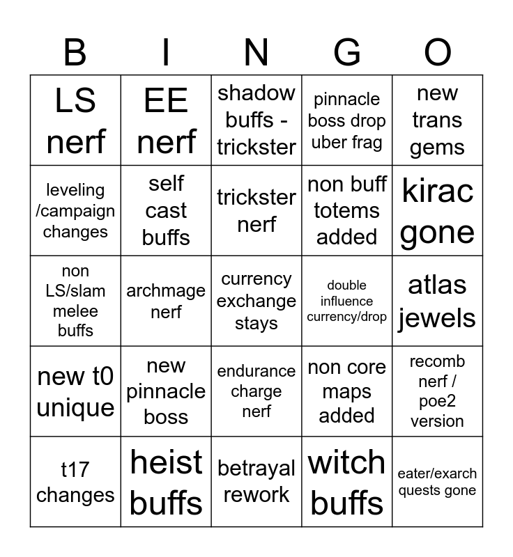 This bingo card has a free space and 24 words: t17 changes, new pinnacle boss, trickster nerf, witch buffs, new trans gems, LS nerf, EE nerf, shadow buffs - trickster, double influence currency/drop, atlas jewels, non LS/slam melee buffs, self cast buffs, non core maps added, recomb nerf / poe2 version, leveling /campaign changes, heist buffs, betrayal rework, pinnacle boss drop uber frag, kirac gone, new t0 unique, archmage nerf, endurance charge nerf, non buff totems added and eater/exarch quests gone.