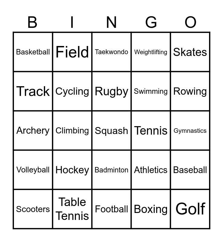 This bingo card has 25 words: Hockey, Football, Rugby, Scooters, Skates, Basketball, Track, Field, Tennis, Badminton, Swimming, Archery, Athletics, Baseball, Cycling, Golf, Gymnastics, Taekwondo, Rowing, Climbing, Squash, Table Tennis, Volleyball, Weightlifting and Boxing.