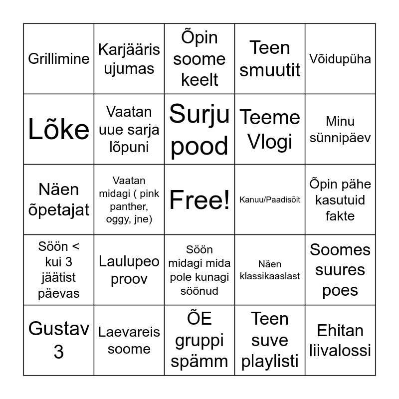 This bingo card has a free space and 24 words: Laulupeo proov, Laevareis soome, Surju pood, Gustav 3, Võidupüha, Grillimine, Lõke, Karjääris ujumas, Kanuu/Paadisõit, Söön midagi mida pole kunagi söönud, Teeme Vlogi, Näen õpetajat, Näen klassikaaslast, Soomes suures poes, Vaatan uue sarja lõpuni, Teen suve playlisti, Õpin pähe kasutuid fakte, Õpin soome keelt, Minu sünnipäev, Vaatan midagi ( pink panther, oggy, jne), Ehitan liivalossi, Söön < kui 3 jäätist päevas, Teen smuutit and ÕE gruppi spämm.