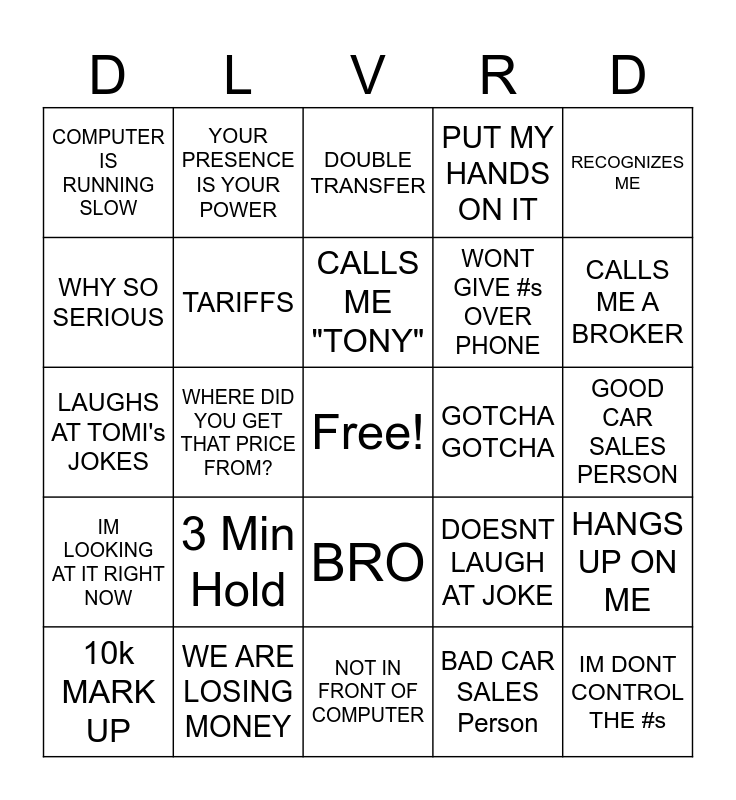 This bingo card has a free space and 24 words: 3 Min Hold, WE ARE LOSING MONEY, CALLS ME "TONY", 10k MARK UP, RECOGNIZES ME, COMPUTER IS RUNNING SLOW, WHY SO SERIOUS, YOUR PRESENCE IS YOUR POWER, GOTCHA GOTCHA, BRO, WONT GIVE #s OVER PHONE, LAUGHS AT TOMI's JOKES, DOESNT LAUGH AT JOKE, HANGS UP ON ME, TARIFFS, BAD CAR SALES Person, GOOD CAR SALES PERSON, DOUBLE TRANSFER, CALLS ME A BROKER, WHERE DID YOU GET THAT PRICE FROM?, IM DONT CONTROL THE #s, IM LOOKING AT IT RIGHT NOW, PUT MY HANDS ON IT and NOT IN FRONT OF COMPUTER.