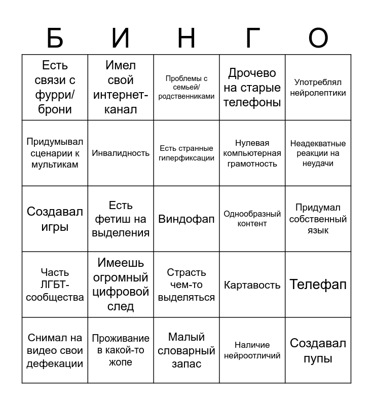 This bingo card has a free space and 24 words: Имеешь огромный цифровой след, Проживание в какой-то жопе, Есть странные гиперфиксации, Снимал на видео свои дефекации, Употреблял нейролептики, Есть связи с фурри/брони, Придумывал сценарии к мультикам, Имел свой интернет-канал, Однообразный контент, Страсть чем-то выделяться, Нулевая компьютерная грамотность, Создавал игры, Картавость, Телефап, Инвалидность, Наличие нейроотличий, Придумал собственный язык, Проблемы с семьей/родственниками, Неадекватные реакции на неудачи, Есть фетиш на выделения, Создавал пупы, Часть ЛГБТ-сообщества, Дрочево на старые телефоны and Малый словарный запас.