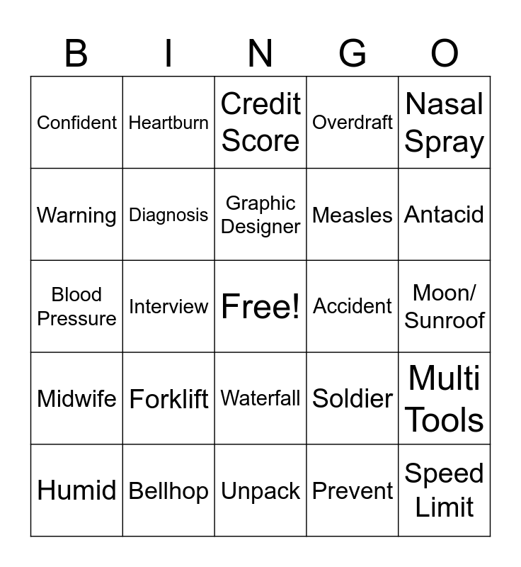 This bingo card has a free space and 29 words: Humid, Guest Services, Interview, Jumper Cables, Confident, Credit Score, Diagnosis, Forklift, Accident, Bellhop, Moon/ Sunroof, Speed Limit, Unpack, Prevent, Antacid, Freezing, Waterfall, Midwife, Nasal Spray, Blood Pressure, Soldier, Japan, Measles, Warning, Overdraft, Heartburn, Multi Tools, Graphic Designer and Blanket.