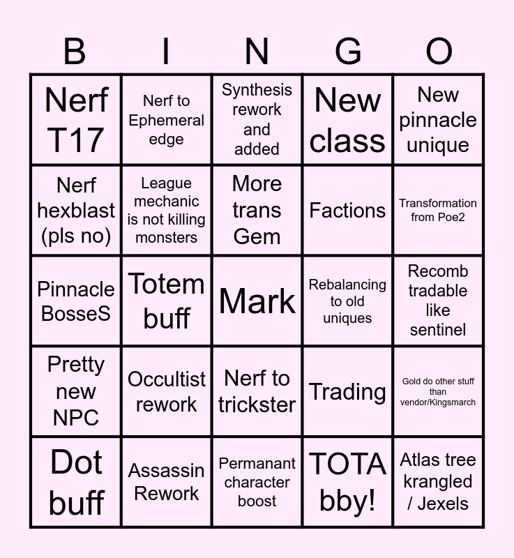 This bingo card has a free space and 24 words: Occultist rework, Assassin Rework, More trans Gem, Dot buff, New pinnacle unique, Nerf T17, Nerf hexblast (pls no), Nerf to Ephemeral edge, Rebalancing to old uniques, Nerf to trickster, Factions, Pinnacle BosseS, Trading, Gold do other stuff than vendor/Kingsmarch, League mechanic is not killing monsters, TOTA bby!, Recomb tradable like sentinel, Synthesis rework and added, Transformation from Poe2, Totem buff, Atlas tree krangled / Jexels, Pretty new NPC, New class and Permanant character boost.