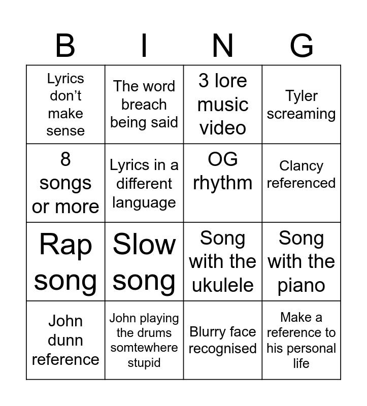 This bingo card has 16 words: John dunn reference, John playing the drums somtewhere stupid, 3 lore music video, Tyler screaming, 8 songs or more, The word breach being said, Song with the ukulele, Song with the piano, Lyrics don’t make sense, Lyrics in a different language, Blurry face recognised, Clancy referenced, Rap song, Slow song, OG rhythm and Make a reference to his personal life.