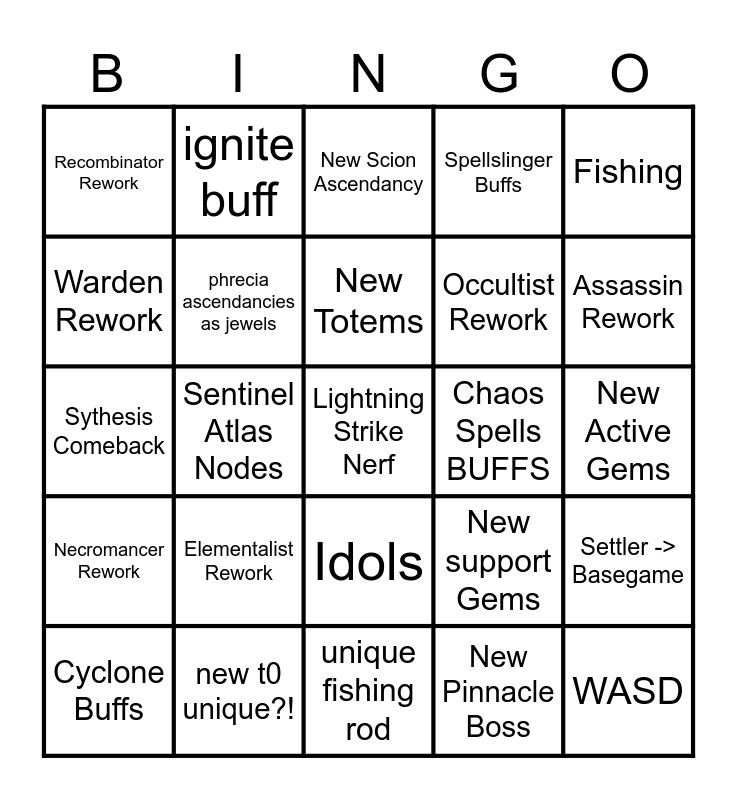 This bingo card has a free space and 24 words: Elementalist Rework, new t0 unique?!, New Totems, Cyclone Buffs, Fishing, Recombinator Rework, Warden Rework, ignite buff, Chaos Spells BUFFS, Idols, Occultist Rework, Sythesis Comeback, New support Gems, Settler -> Basegame, phrecia ascendancies as jewels, New Pinnacle Boss, New Active Gems, New Scion Ascendancy, Assassin Rework, Sentinel Atlas Nodes, WASD, Necromancer Rework, Spellslinger Buffs and unique fishing rod.