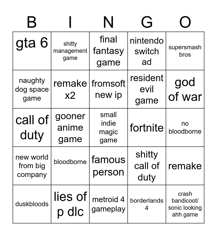 This bingo card has a free space and 24 words: bloodborne, lies of p dlc, fromsoft new ip, duskbloods, supersmash bros, gta 6, naughty dog space game, shitty management game, fortnite, famous person, resident evil game, call of duty, shitty call of duty, remake, remake x2, borderlands 4, no bloodborne, final fantasy game, god of war, gooner anime game, crash bandicoot/ sonic looking ahh game, new world from big company, nintendo switch ad and metroid 4 gameplay.