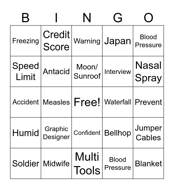 This bingo card has a free space and 29 words: Soldier, Unpack, Measles, Heartburn, Freezing, Warning, Antacid, Graphic Designer, Waterfall, Midwife, Prevent, Blanket, Multi Tools, Blood Pressure, Nasal Spray, Guest Services, Confident, Humid, Blood Pressure, Accident, Bellhop, Forklift, Interview, Speed Limit, Japan, Credit Score, Jumper Cables, Moon/ Sunroof and Diagnosis.