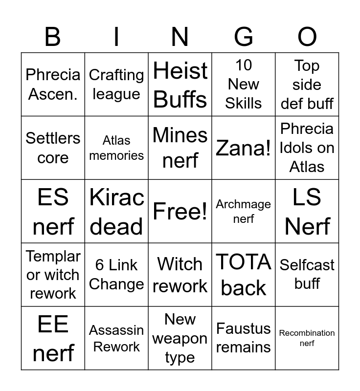This bingo card has a free space and 24 words: 6 Link Change, Assassin Rework, Mines nerf, EE nerf, Top side def buff, Phrecia Ascen., Settlers core, Crafting league, Archmage nerf, Witch rework, Zana!, ES nerf, TOTA back, Selfcast buff, Atlas memories, Faustus remains, LS Nerf, Heist Buffs, Phrecia Idols on Atlas, Kirac dead, Recombination nerf, Templar or witch rework, 10 New Skills and New weapon type.