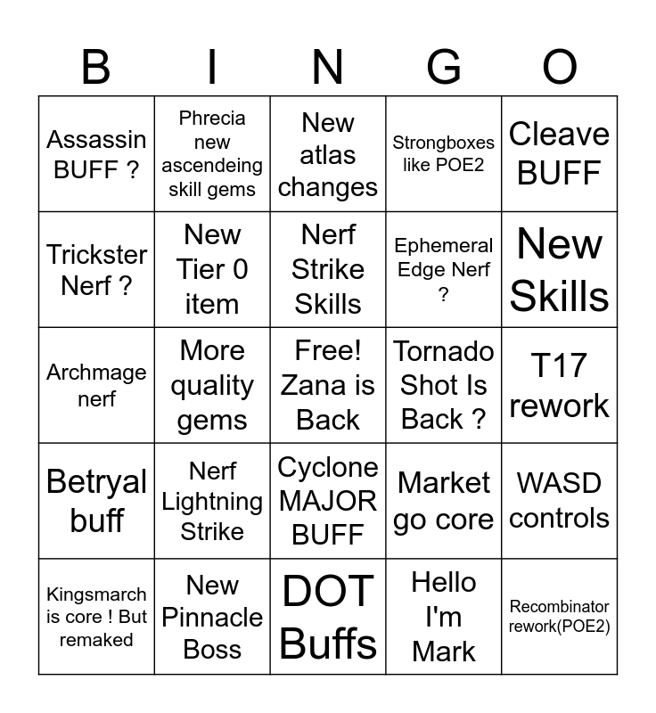 This bingo card has a free space and 24 words: Nerf Lightning Strike, New Pinnacle Boss, Nerf Strike Skills, Kingsmarch is core ! But remaked, Cleave BUFF, Assassin BUFF ?, Trickster Nerf ?, Phrecia new ascendeing skill gems, Tornado Shot Is Back ?, Cyclone MAJOR BUFF, Ephemeral Edge Nerf ?, Archmage nerf, Market go core, WASD controls, New Tier 0 item, Hello I'm Mark, T17 rework, New atlas changes, New Skills, More quality gems, Recombinator rework(POE2), Betryal buff, Strongboxes like POE2 and DOT Buffs.