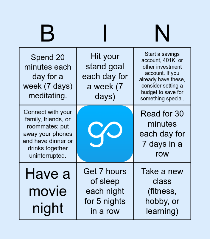 This bingo card has a free space and 24 words: Drink 8-8oz glasses of water (64oz) each day for 1 week (7 days), Take a 20 minute walk on your lunch break, Get 7 hours of sleep each night for 5 nights in a row, Have a date night or friends night, Take a new class (fitness, hobby, or learning), Spend 20 minutes each day for a week (7 days) meditating., Read for 30 minutes each day for 7 days in a row, Hit your stand goal each day for a week (7 days), Get 30 minutes of activity each day for 1 week (7 days), Take some time to review your eating habits; journaling daily is a great way to do so. Is your diet balanced?, If you haven't done so already schedule your annual physical; if you've had your annual physical, review your results and come up with a plan to reach your goals, Walk 10,000 steps each day for 7 days in a row., Host a healthy eating recipe exchange with friends, family, or coworkers either in person or virtually., complete a workout with a friend or family member, Have a movie night, Shut down all electronics 1 hour before bedtime for 1 week (7days), book a spa appointment(massage, manicure, pedicure, facial etc.), Start a savings account, 401K, or other investment account. If you already have these, consider setting a budget to save for something special., Speak with your team lead to change your one-on-one to a walking meeting at least once per week, Find a podcast, article, or documentary to learn about a new topic you are interested in, Start a wellness journal and spend 20 minutes each day for 7 days reflecting on your day and journaling thoughts, gratitude’s, opportunities, etc., Connect with your family, friends, or roommates; have dinner together, Connect with your family, friends, or roommates; put away your phones and have dinner or drinks together uninterrupted. and Volunteer.