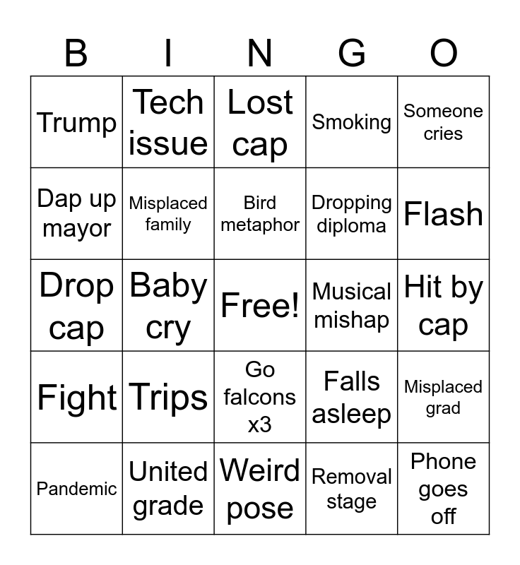 This bingo card has a free space and 24 words: Trips, United grade, Bird metaphor, Pandemic, Someone cries, Trump, Dap up mayor, Tech issue, Musical mishap, Go falcons x3, Dropping diploma, Drop cap, Falls asleep, Misplaced grad, Misplaced family, Removal stage, Hit by cap, Lost cap, Flash, Baby cry, Phone goes off, Fight, Smoking and Weird pose.
