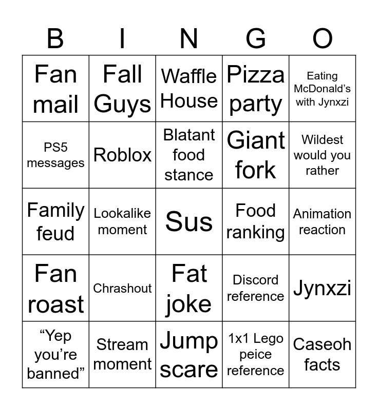 This bingo card has a free space and 24 words: Chrashout, Stream moment, Blatant food stance, “Yep you’re banned”, Eating McDonald’s with Jynxzi, Fan mail, PS5 messages, Fall Guys, Food ranking, Fat joke, Giant fork, Family feud, Discord reference, Jynxzi, Roblox, 1x1 Lego peice reference, Animation reaction, Waffle House, Wildest would you rather, Lookalike moment, Caseoh facts, Fan roast, Pizza party and Jump scare.