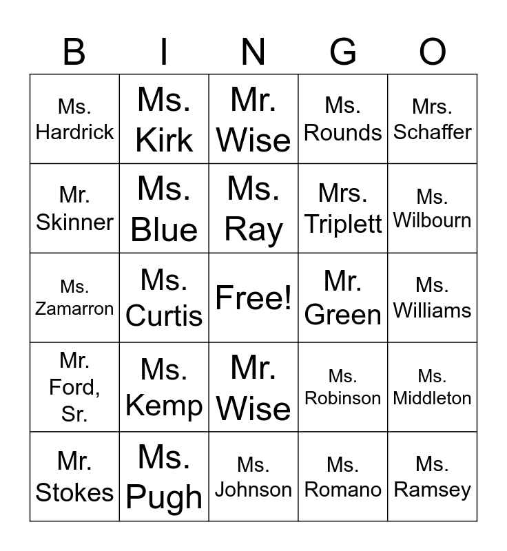 This bingo card has a free space and 24 words: Ms. Kemp, Ms. Pugh, Ms. Ray, Mr. Stokes, Mrs. Schaffer, Ms. Hardrick, Mr. Skinner, Ms. Kirk, Mr. Green, Mr. Wise, Mrs. Triplett, Ms. Zamarron, Ms. Robinson, Ms. Middleton, Ms. Blue, Ms. Romano, Ms. Williams, Mr. Wise, Ms. Wilbourn, Ms. Curtis, Ms. Ramsey, Mr. Ford, Sr., Ms. Rounds and Ms. Johnson.