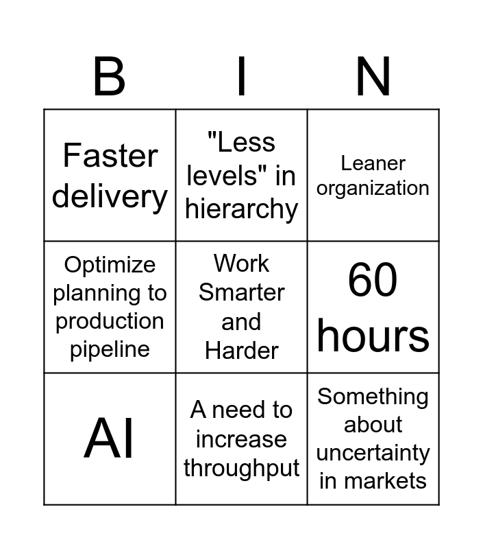 This bingo card has a free space and 8 words: 60 hours, Leaner organization, "Less levels" in hierarchy, AI, Faster delivery, Something about uncertainty in markets, Optimize planning to production pipeline and A need to increase throughput.