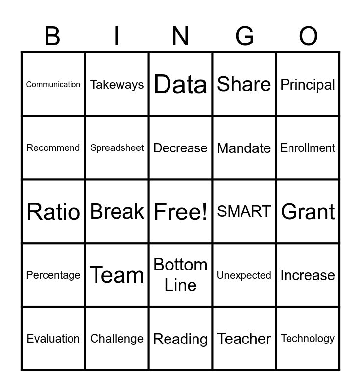 This bingo card has a free space and 29 words: Evaluation, Budget, Break, Allocation, Communication, Data, Spreadsheet, Team, SMART, Challenge, Grant, Technology, Reading, Teacher, Enrollment, Resources, Bottom Line, Percentage, Principal, Ratio, Unexpected, Substitute, Mandate, Recommend, Share, Takeways, Increase, Decrease and Support.