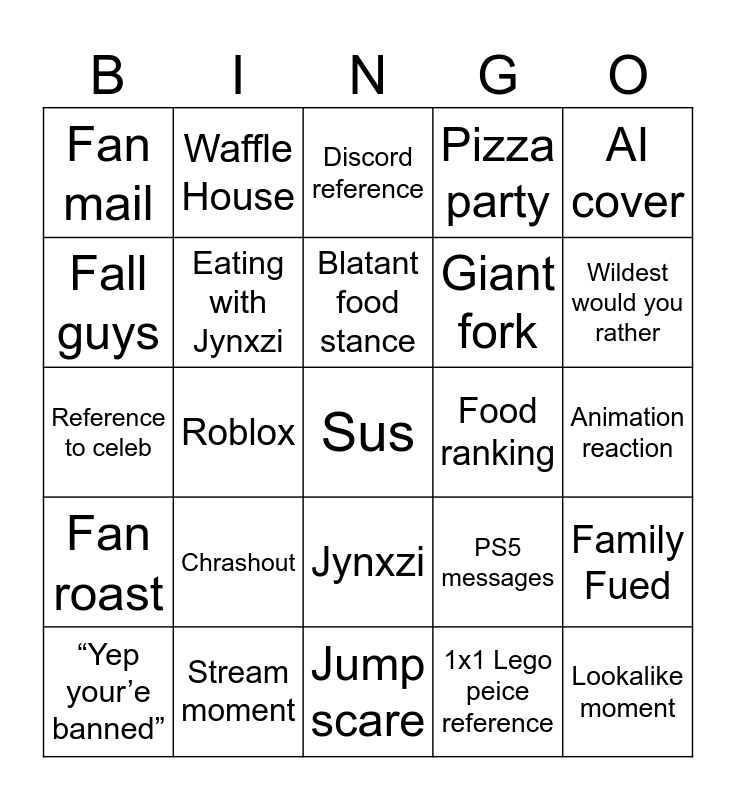 This bingo card has a free space and 24 words: Chrashout, Stream moment, Blatant food stance, “Yep your’e banned”, AI cover, Fan mail, Fall guys, Waffle House, Food ranking, Jynxzi, Giant fork, Reference to celeb, PS5 messages, Family Fued, Eating with Jynxzi, 1x1 Lego peice reference, Animation reaction, Discord reference, Wildest would you rather, Roblox, Lookalike moment, Fan roast, Pizza party and Jump scare.