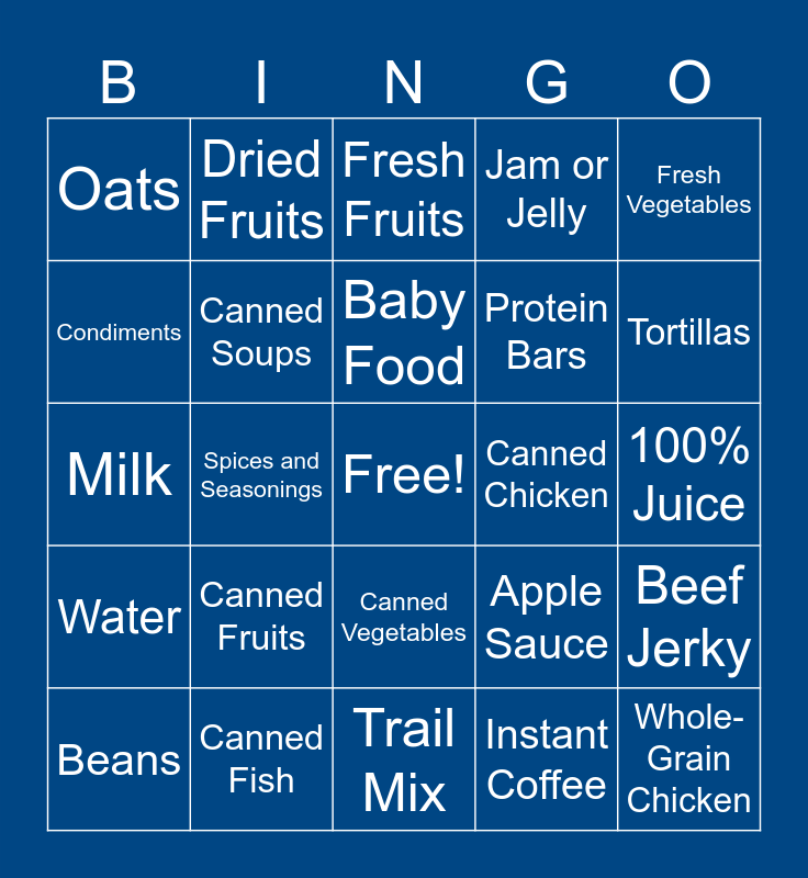 This bingo card has a free space and 24 words: Canned Fruits, Canned Fish, Baby Food, Beans, Fresh Vegetables, Oats, Condiments, Dried Fruits, Canned Chicken, Canned Vegetables, Protein Bars, Milk, Apple Sauce, Beef Jerky, Canned Soups, Instant Coffee, 100% Juice, Fresh Fruits, Tortillas, Spices and Seasonings, Whole-Grain Chicken, Water, Jam or Jelly and Trail Mix.
